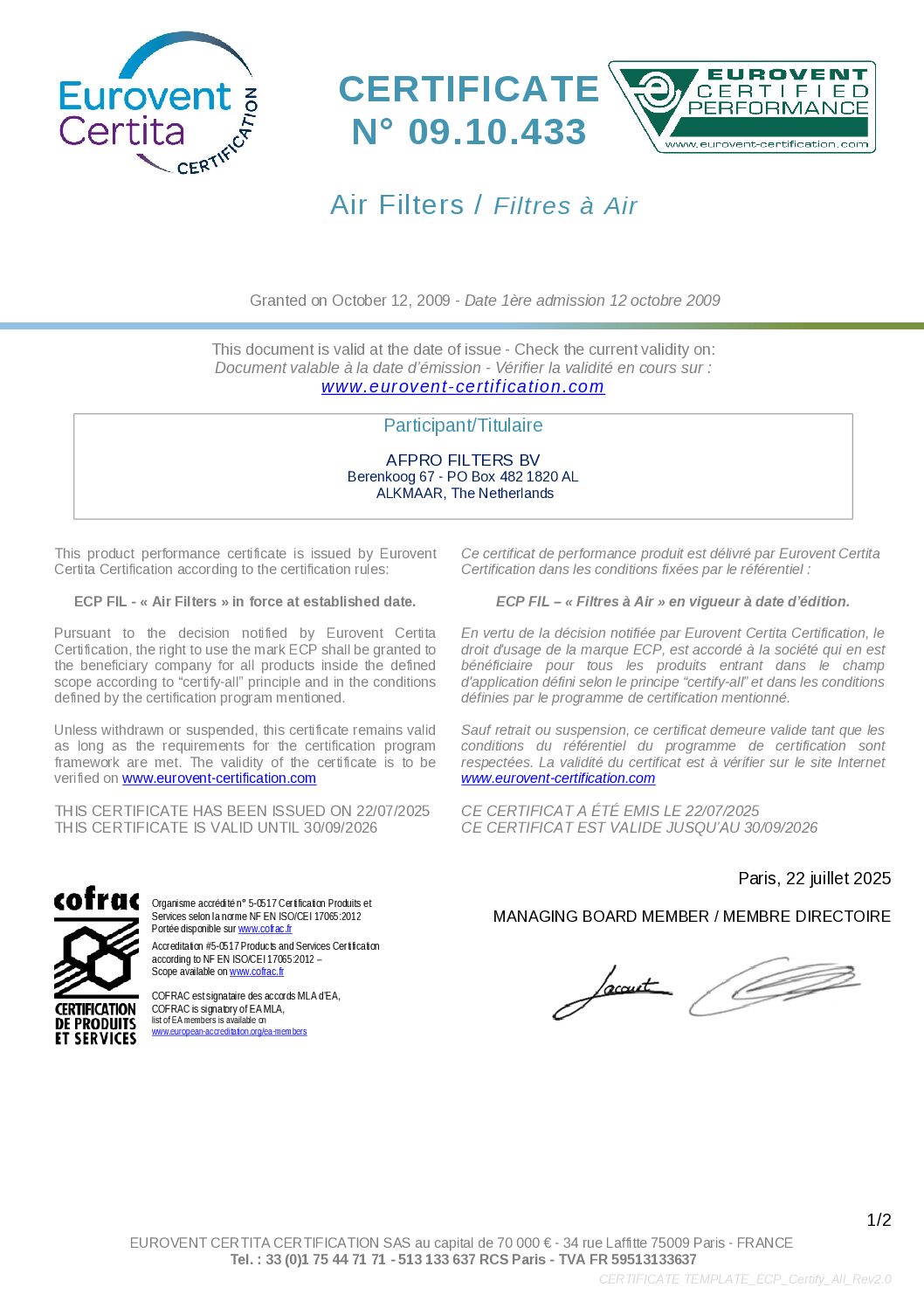 La gamme des filtres fins répond aux exigences de la norme ISO 16890, les filtres fins ont été certifiés sous le numéro 09.10.433 et sont présents sur le site internet de l’organisation Eurovent, à la rubrique des filtres à air certifiés. Pour plus de détails, cliquez sur ce lien : www.eurovent-certification.com.