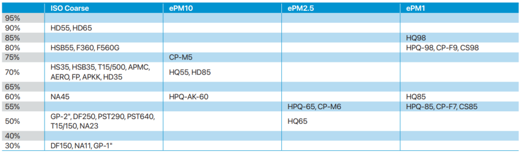 Binnen de verschillende groepen wordt onderscheid gemaakt op basis van de procentuele efficiëntie. Dit percentage ronden we op 5% naar beneden af. Bent u op zoek naar een filter dat 60% van alle deeltjes die kleiner zijn dan 1 micron afvangt? Dan kiest u voor een ePM1 60% filter. Moet 80% van die deeltjes worden tegengehouden? Dan is een ePM1 80% filter de juiste keuze.